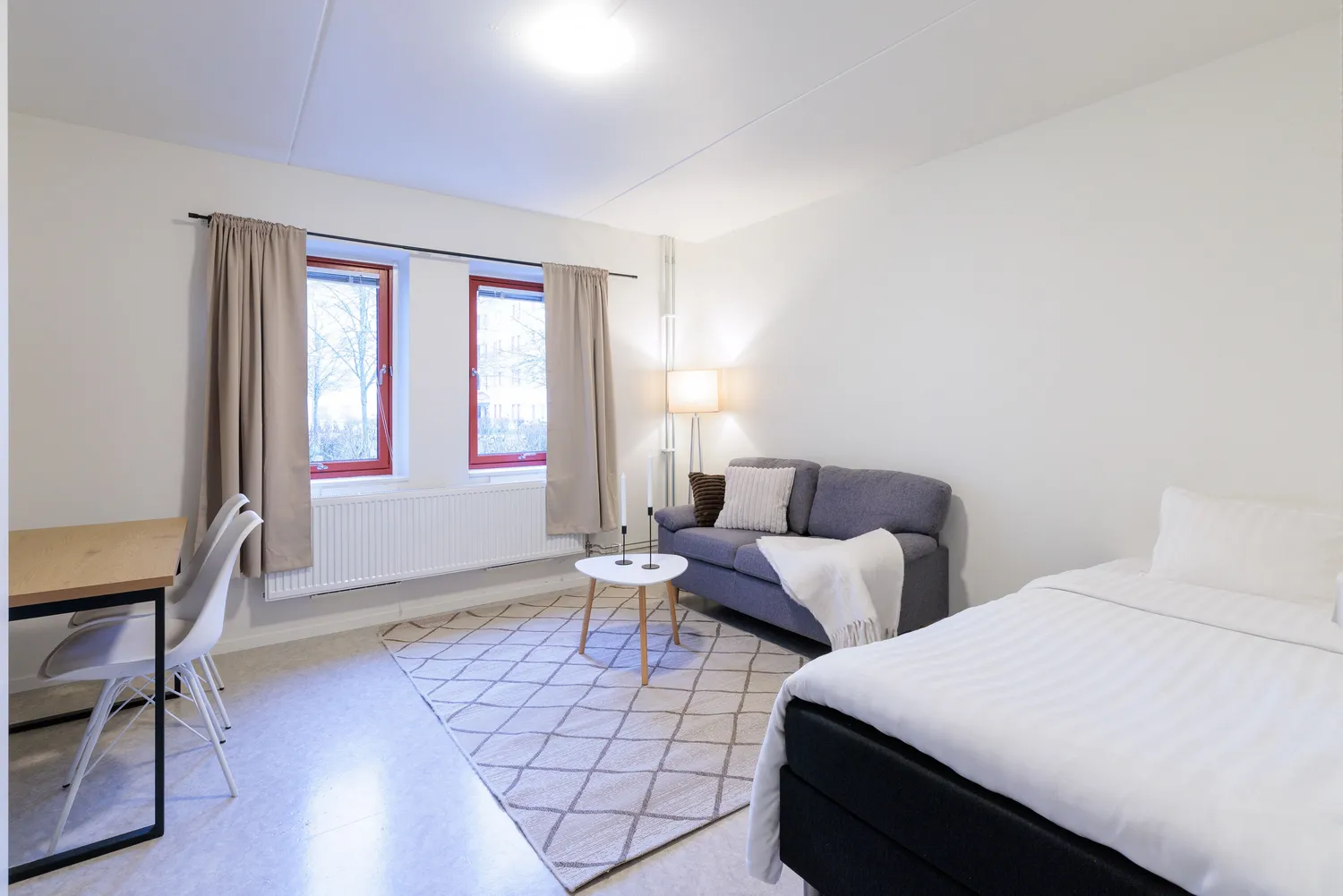 Här erbjuder vi lägenheter med komplett kök, badrum med dusch och med full möblering i form av en enkelsäng, soffa, matbord, stolar, och TV. Dessa är utrustade med allt från köksutrustning till sänglinne och handdukar ingår alltid.