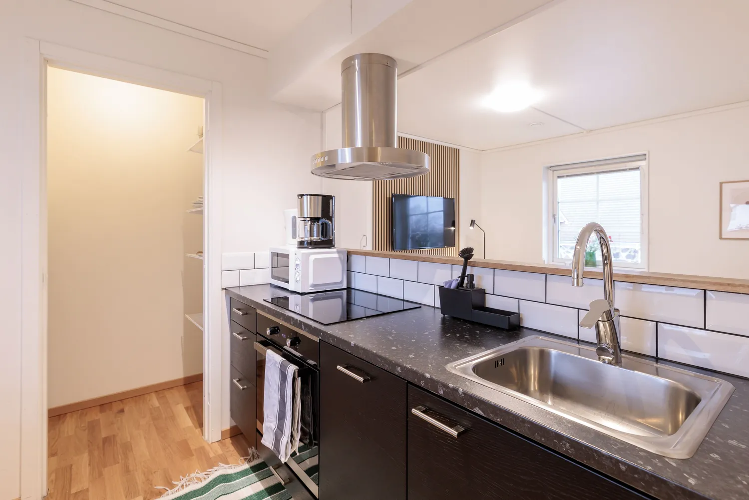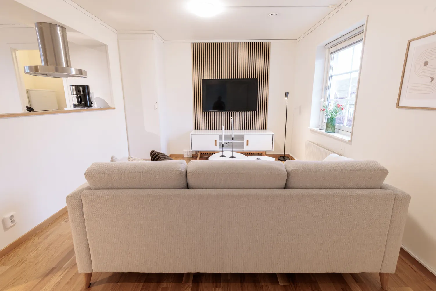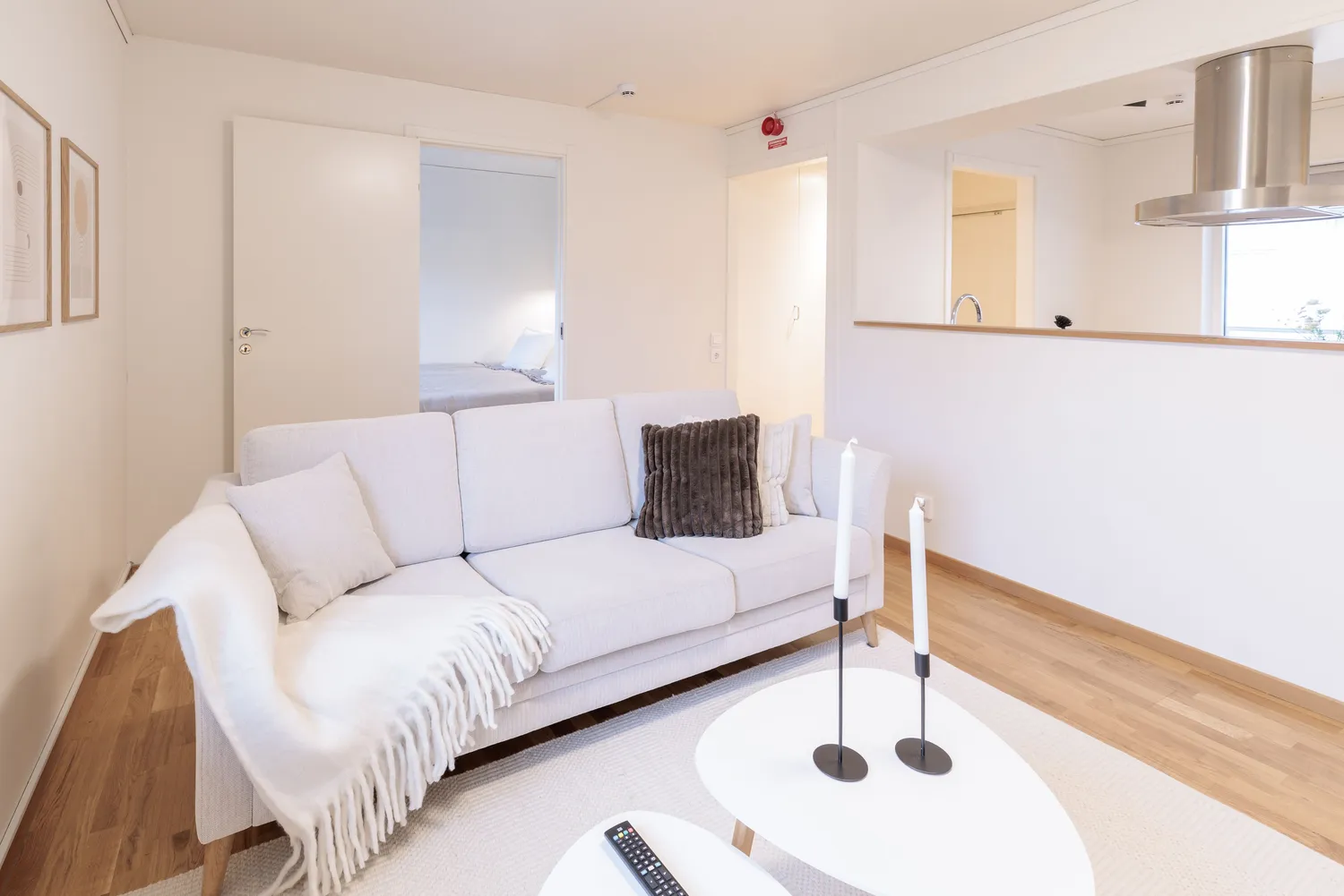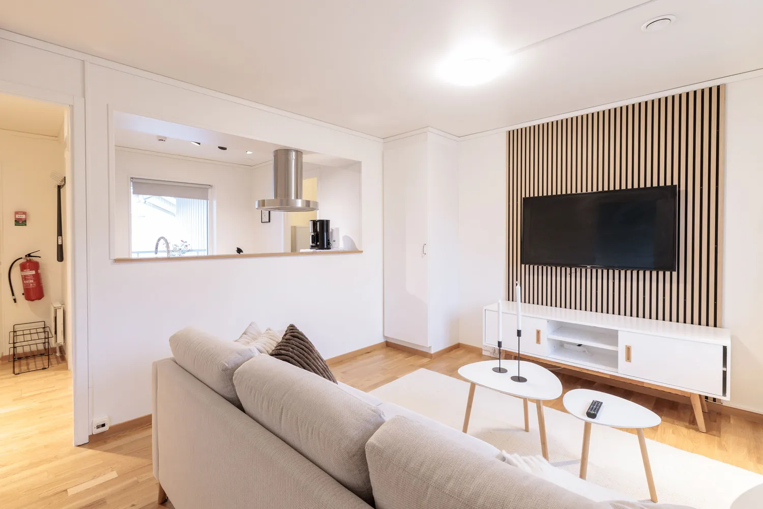 Vardagsrumsdelen har soffa och Ultra HD smart-TV, medan sovrummet är möblerat med en kontinental dubbelsäng. Vid behov kan en extrasäng ordnas i mån av tillgång. Badrummet är modernt inrett och utrustat med takdusch. Lägenheten har även strykjärn och strykbräda, hårfön, dammsugare och sopset. Sängkläder och handdukar ingår.