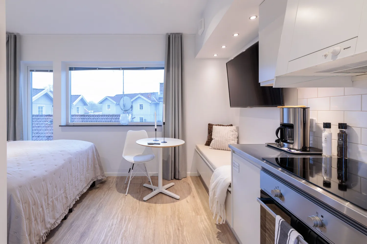 Nybyggd och fullt möblerad lägenhet på 22 kvm, belägen på plan 2. Den öppna planlösningen rymmer sovrumsdel, kök och ett rymligt badrum. Badrummet har modern inredning med helkaklade väggar och stengolv. Köket är utrustat med kylskåp, mikrovågsugn, spis, ugn, diskmaskin, kaffemaskin, komplett köksutrustning och sopset.